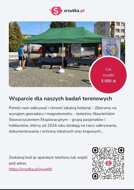 Kochani! Tak jak obiecywaliśmy, działamy z nowymi projektami. Nowy rok, nowe pomysły i plany. Nowe miejsca do poszukiwań i więcej Nas w przestrzeni publicznej. Do realizacji części z nich jest nam niezbędny georadar i magnetometr. Do jednej z akcji potrzebujemy skorzystać z usług nurka. Zbieramy pieniążki na namiot wystawowy, gablotę wystawienniczą…